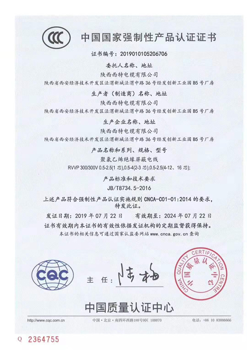陜西西特電纜有限公司于2019年7月通過中國質量認證中心CQC認證,取得了CCC強制認證證書!